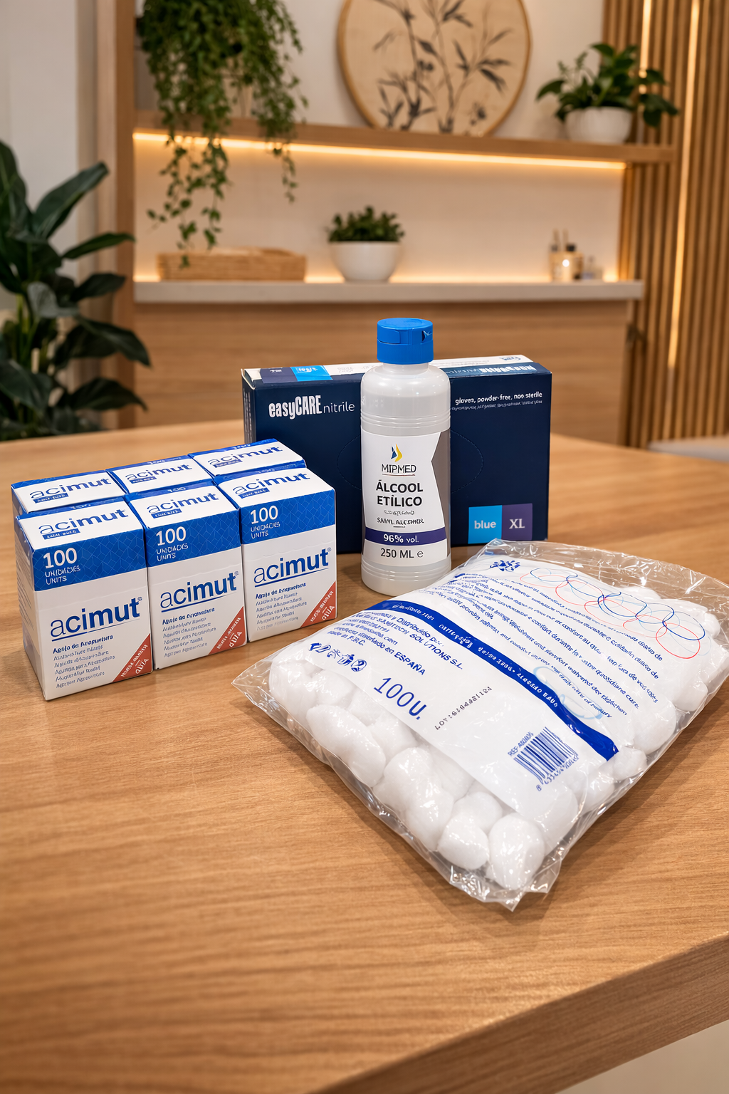 6 caixas de Acimut 100 c/ guia + 1 caixa de luvas de nitrilo EasyCare (100 unidades) + 1 frasco de álcool etílico, 70% (250 ml) + 1 embalagem de algodão em bolas Alba (100 unidades)