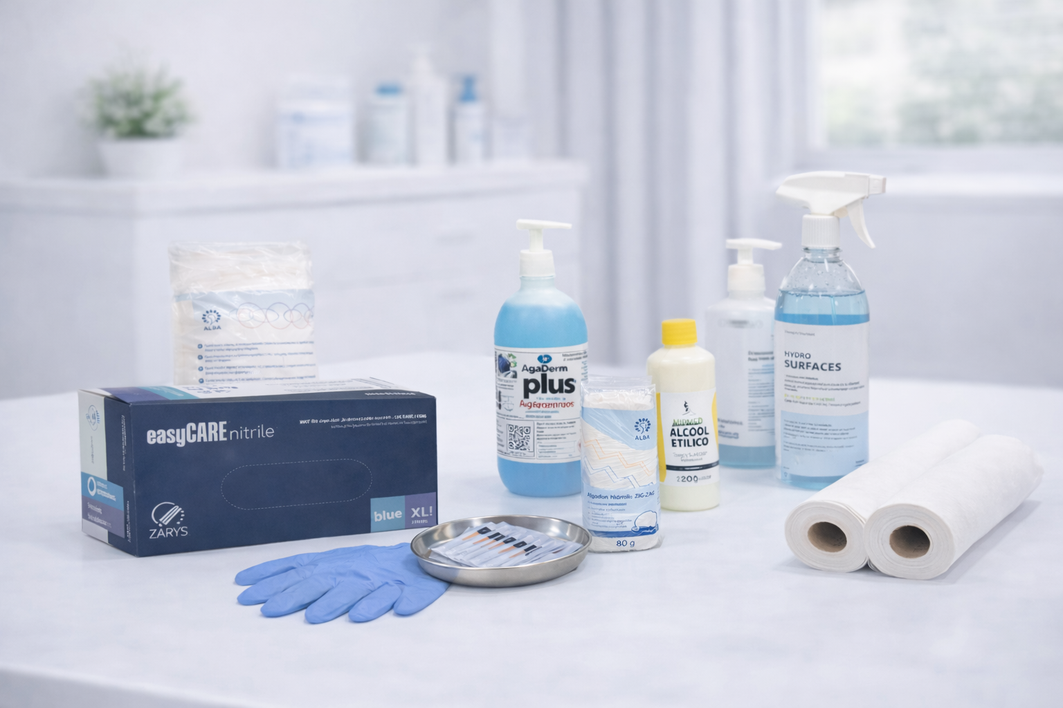 6 caixas Acimut 100 c/ guia + 2 rolos de marquesa TNT, 10 gr, 60cmx100m + 1 desinfetante de marquesa Hydru Surfaces 1L + 1 caixa de luvas EasyCare (100 unidades) + 1 frasco de álcool etílico, 70%, (250ml)+ 1 embalagem de algodão em bolas (100 unidades)