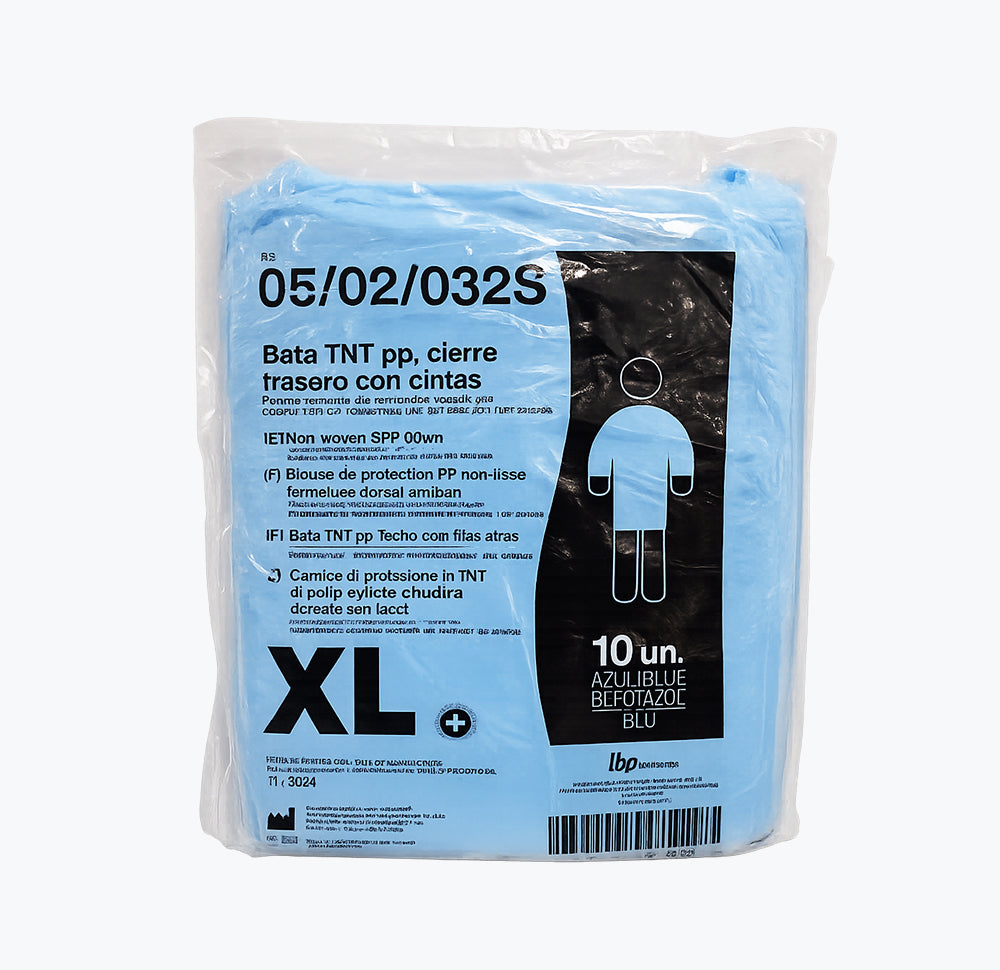 - Tipo: Bata descartável com fechamento traseiro;