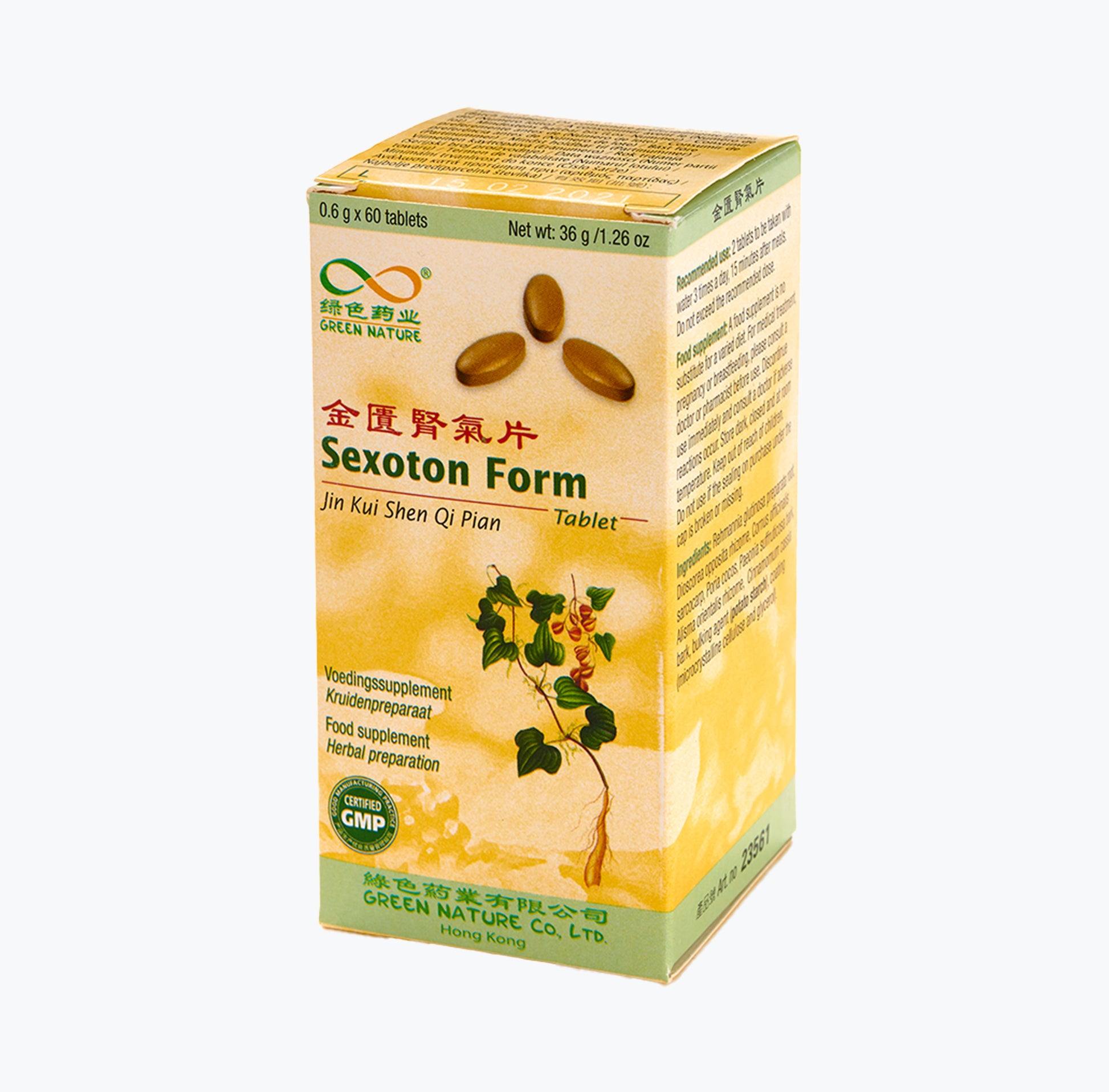 Rehmannia glutinosa preparata root 168.6mg, Dioscorea opposita rhizome 84.6mg, Cornus officinalis sarcocarp 84.6mg, Poria cocos 63mg, Paeonia suffruticosa bark 63mg, Alisma orientalis rhizome 63mg, Cinnamomum cassia bark 42.6mg, agente de volume (amido, estereato de magnésio), agente de revestimento (celulose microcristalina, glicerol).