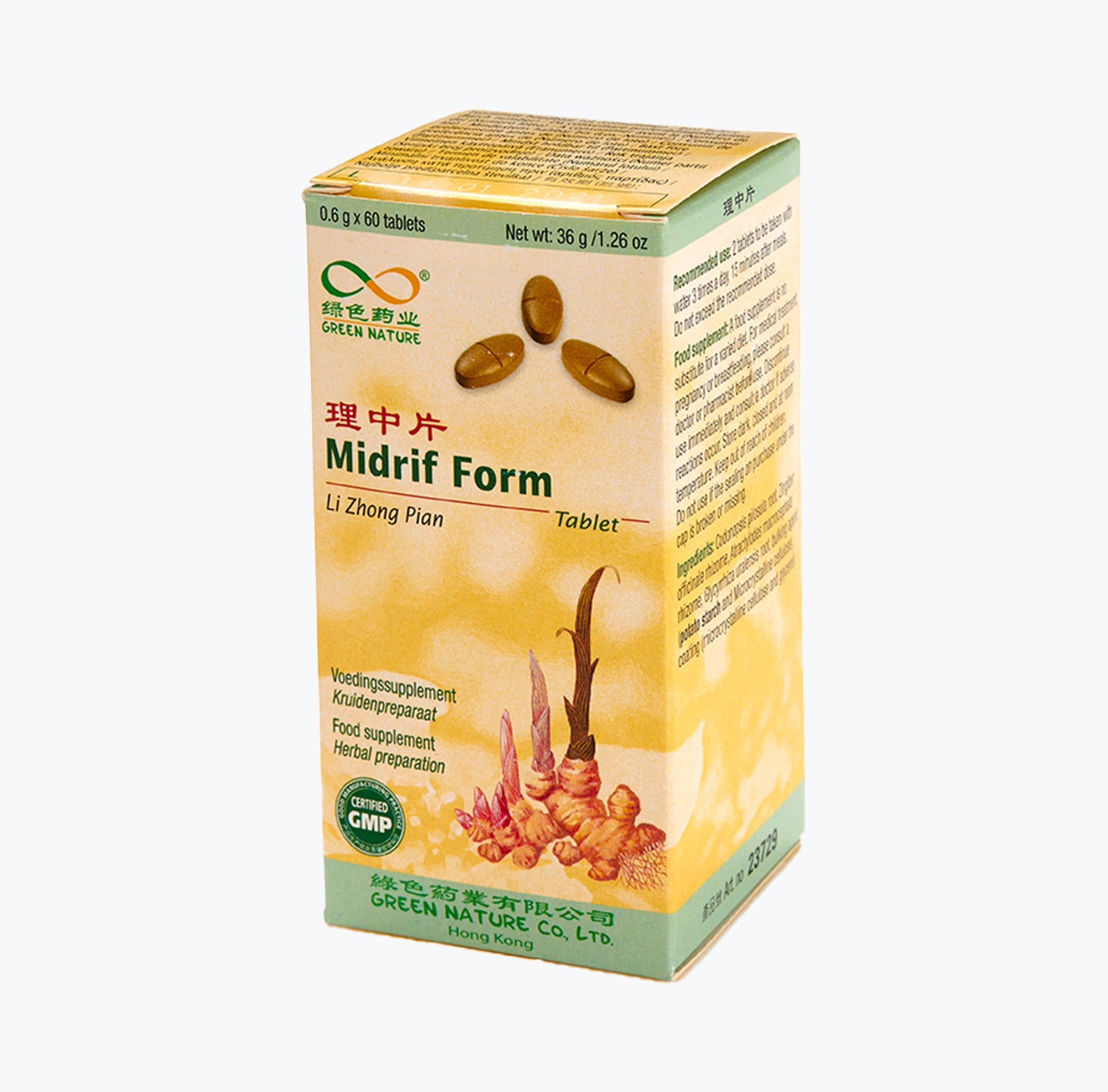Codonopsis pilosula root 144mg, Zingiber officinale rhizome 144mg, Atractylodes macrocephala rhizome 141mg, Glycyrrhiza uralensis root 141mg, agente de volume (amido, estereato de magnésio), agente de revestimento (celulose microcristalina, glicerol).