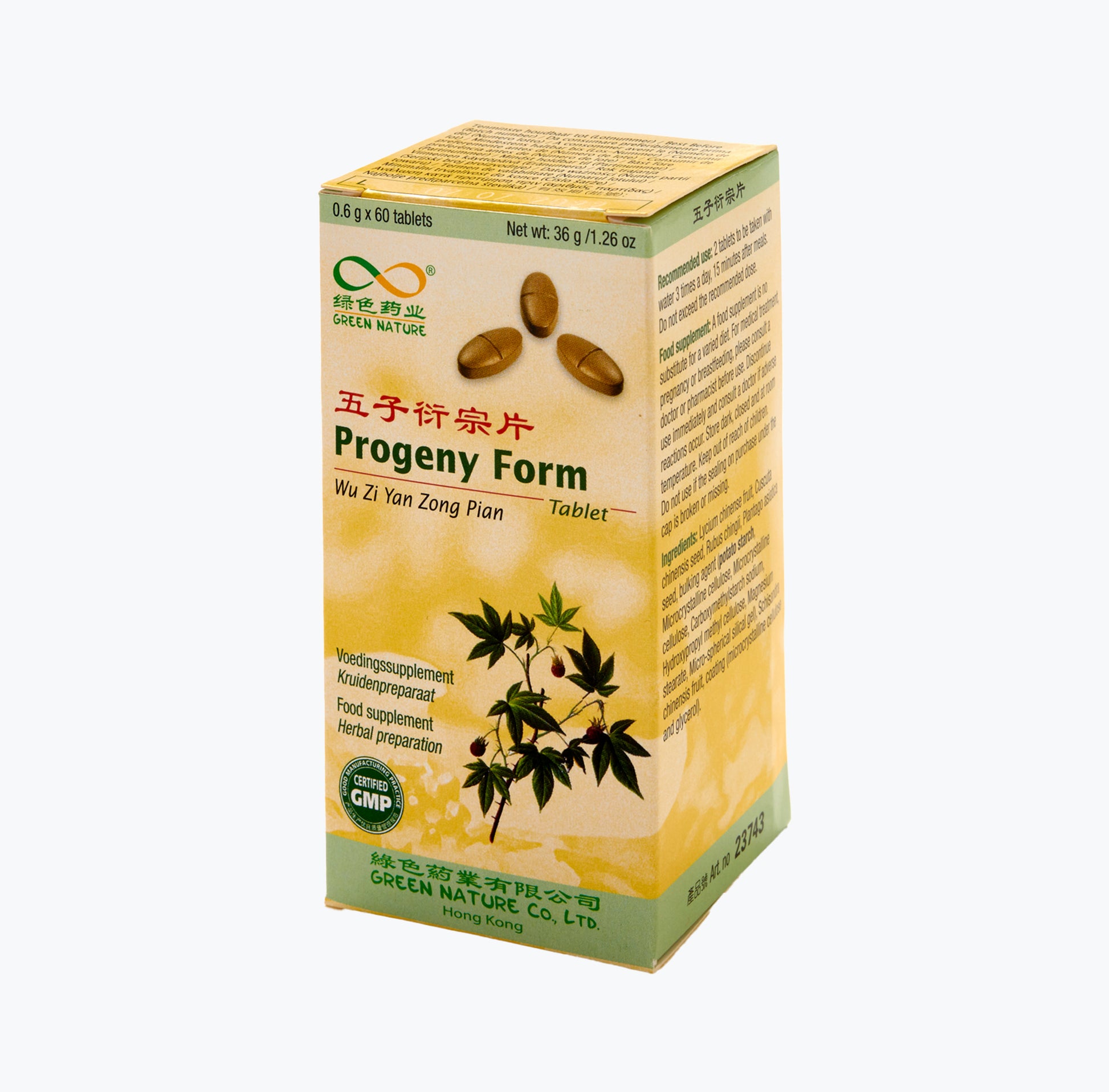 Lycium chinense fruit 198mg, Cuscuta chinensis seed 198mg, Rubus chingii 99mg, Plantago asiatica seed 49.8mg, Schisandra chinensis fruit 24.6mg, excipiente (amido & estereato de magnésio), revestimento (celulose microcristalina e glicerol).